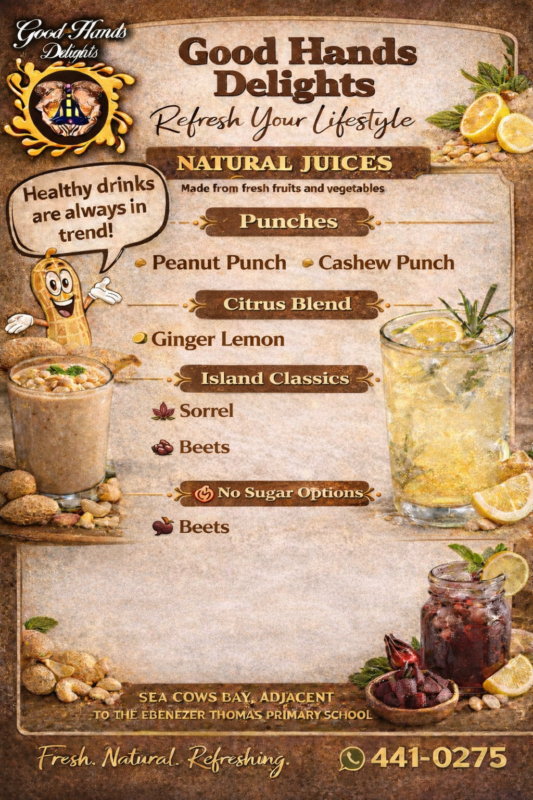 At Good Hands Delights, every day is an opportunity to bring fresh, natural flavors to the community. Our drinks are crafted with care using real ingredients, bold Caribbean flavors, and blends that nourish both the body and the taste buds. Today’s menu features a balanced lineup of creamy punches, refreshing citrus blends, and classic island favorites.
